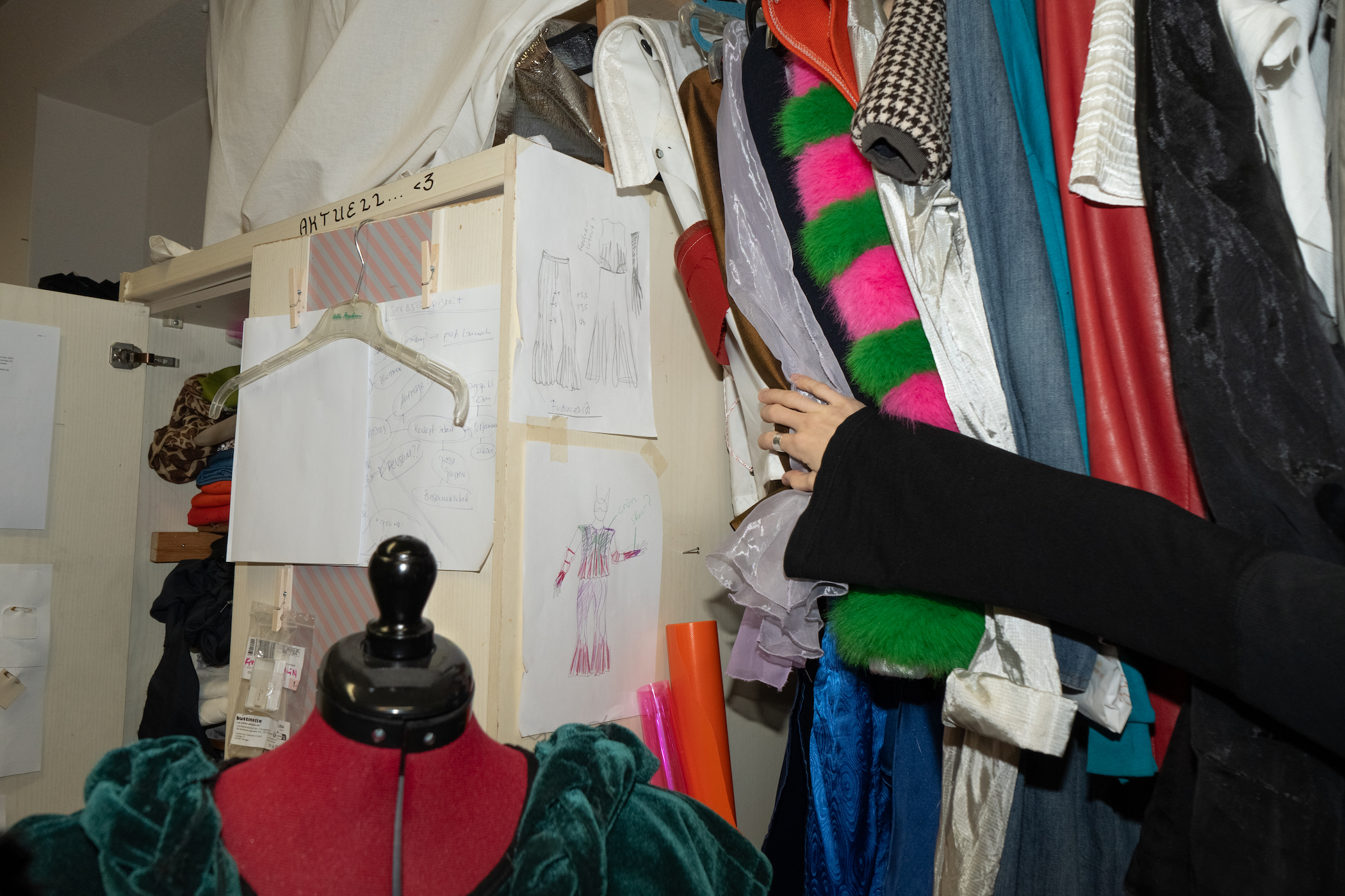 Emilia: Von diesen Materialien lassen wir uns oft auch inspirieren. Es kommt selten vor, dass wir einen Entwurf zeichnen und dann den passenden Stoff suchen. Vielmehr versuchen wir, aus jedem Stoff, den wir finden, das Beste rauszuholen.