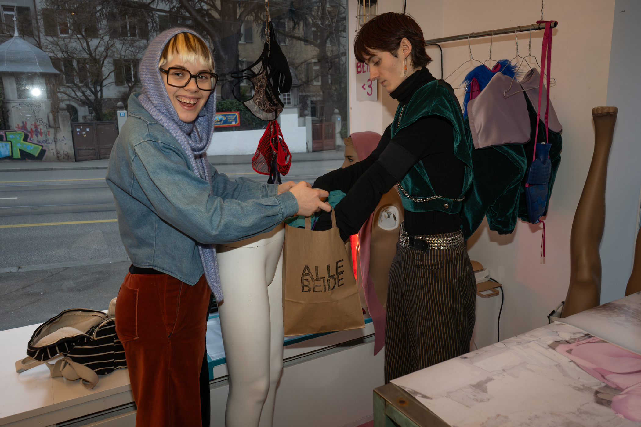 Rachel: Dort nähen wir nicht auf Auftrag, sondern setzen eigene Ideen um. Wir verkaufen fertige Stücke – nicht nur Hosen – und sind da, um Bestellungen entgegenzunehmen oder Ideen zu besprechen. Vor allem geht es aber auch um den Beziehungsaspekt und darum, aus unserem oft sehr ruhigen Atelier rauszukommen und mit den Leuten, die unsere Arbeit nice finden, ins Gespräch zu kommen, abzuhängen.