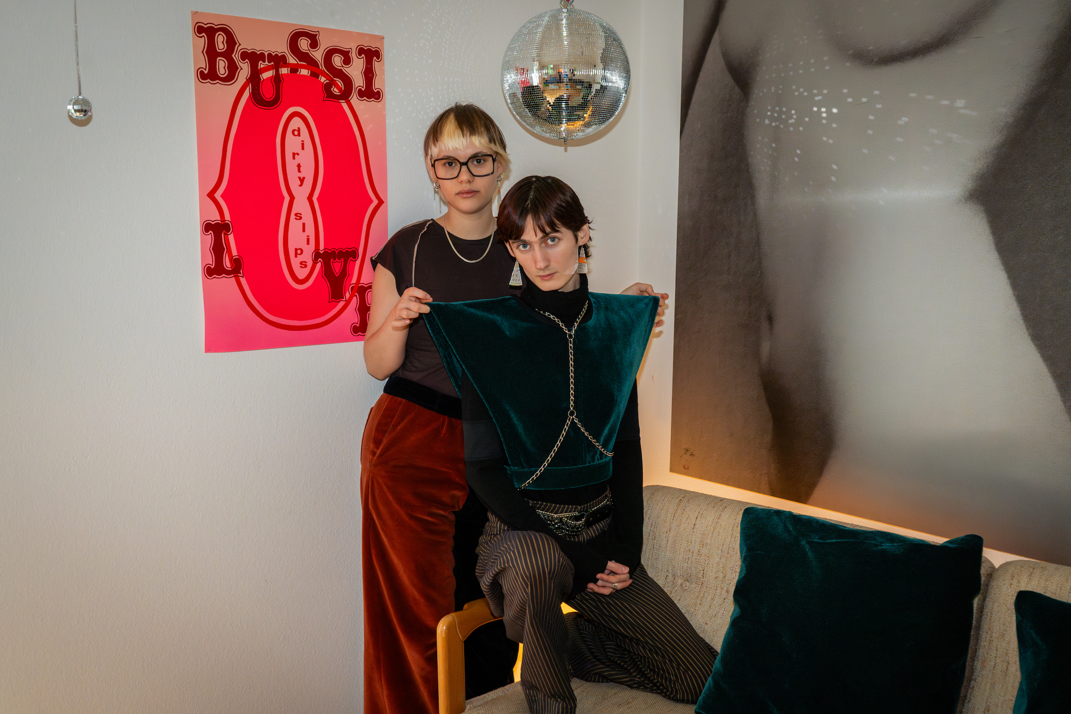 Rachel: Am Anfang dieser Atelierzeit hatten wir noch kein ausgereiftes Konzept, aber durch die Möglichkeit, diesen Raum nutzen zu können, konnten wir unsere Arbeitsweise finden. Im Herbst 2023 ist die Zürcher Band Dirty Slips durch Zufall auf uns gestossen. Im Laufe der Arbeit an den ersten Kostümen für sie haben wir uns dann entschieden, einen gemeinsamen Auftritt unter dem Namen «ALLE BEIDE» zu entwickeln.